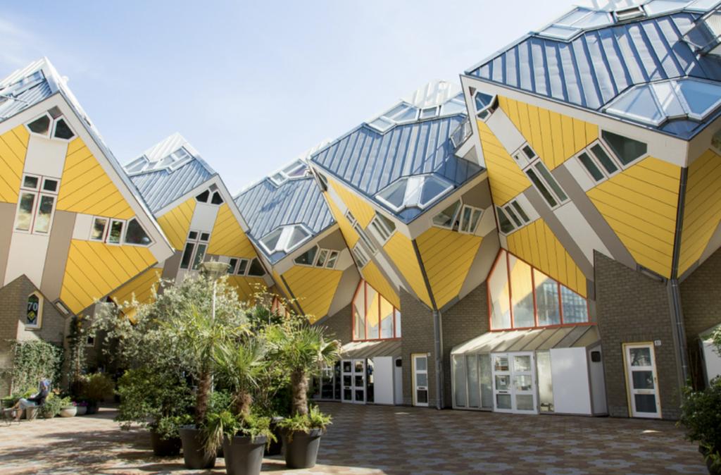 布鲁塞尔——鹿特丹 A:立体方块屋(英语:Cube House,荷兰语: Kijk-Kubus )是一群建筑集合,位于荷兰鹿特丹旧港区,由建筑师布洛姆所设计。 布洛姆设计的方块屋为立方体,倾斜45度。每一间房子代表一颗树,所有的房子代表一片森林。橙⻩色的房屋群构成了一道美丽的⻛景。