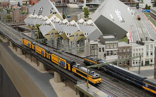 B:鹿特丹迷你世界(英语:Miniworld Rotterdam),占地500平米,是世界上最大的室内微缩景观。这里将这个鹿特丹市的城市⻛貌栩栩如生的展现在您的眼前。城市⻛光,沿海淤田、海港美景统统制成模型,尽收眼底。⻓达2000米的铁轨和100多辆微缩火⻋模型令人惊叹。游客还可进入工作室了 解这些栩栩如生的模型是如何制作和运转的。
